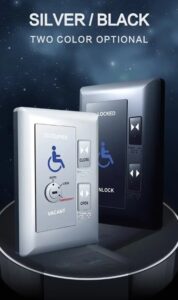 - Nút nhấn bên ngoài có nút “Open” (Mở) và đèn báo trạng thái (Xanh: Trống / Đỏ: Đang có người)