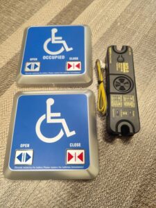 Cửa nhà vệ sinh có nút nhấn người khuyết tật